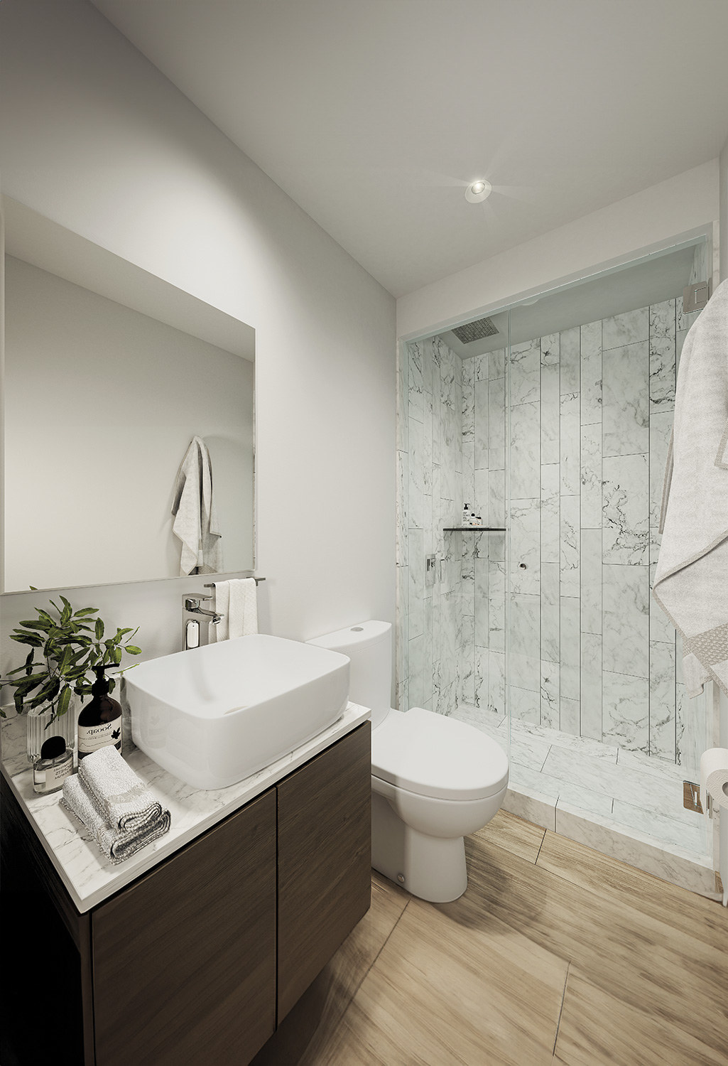En los baños, la distinción se eleva al máximo. Los pisos y muros revestidos en mármol evocan un aire de lujo atemporal, proyectando una estética que combina pureza y fuerza material.