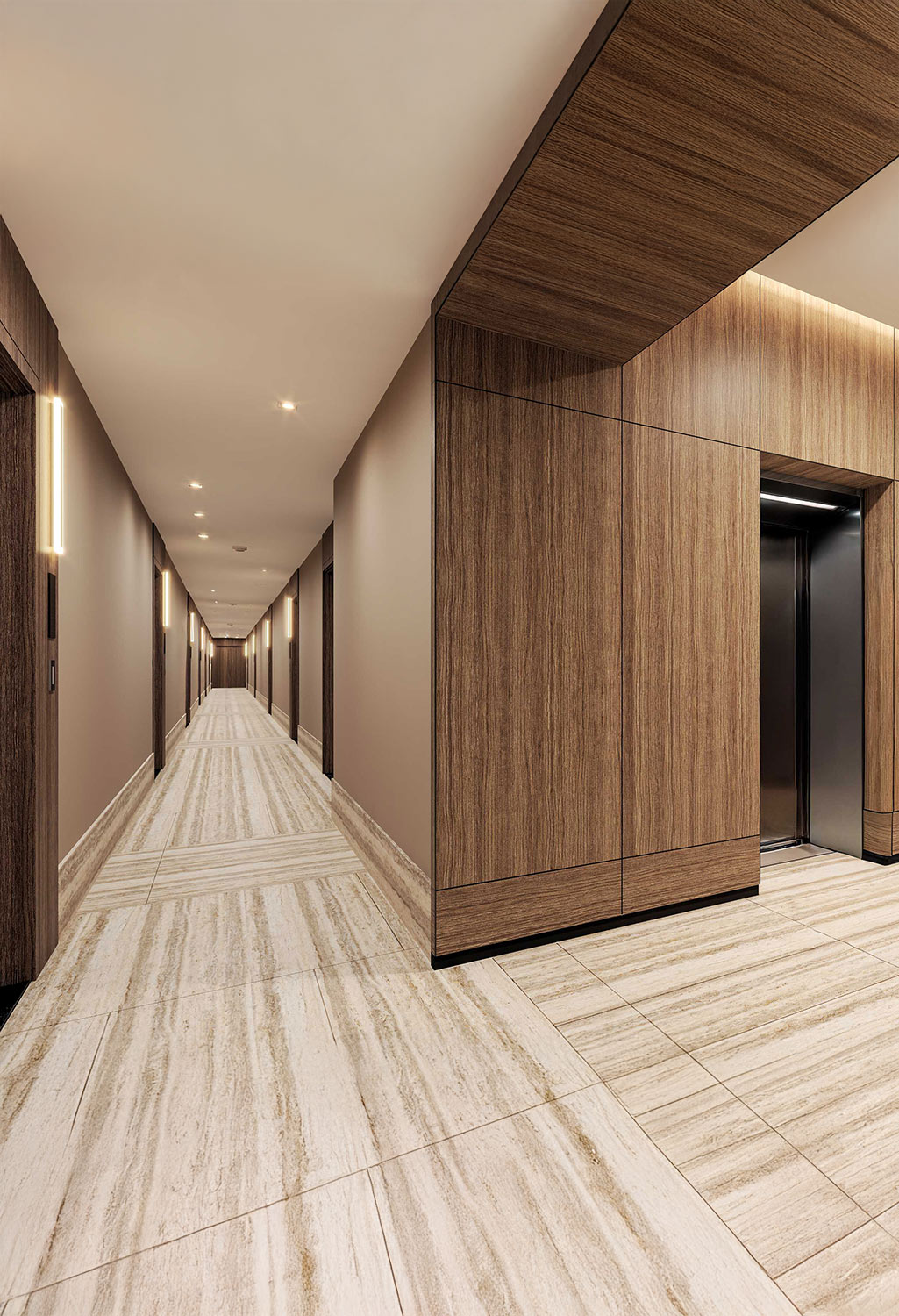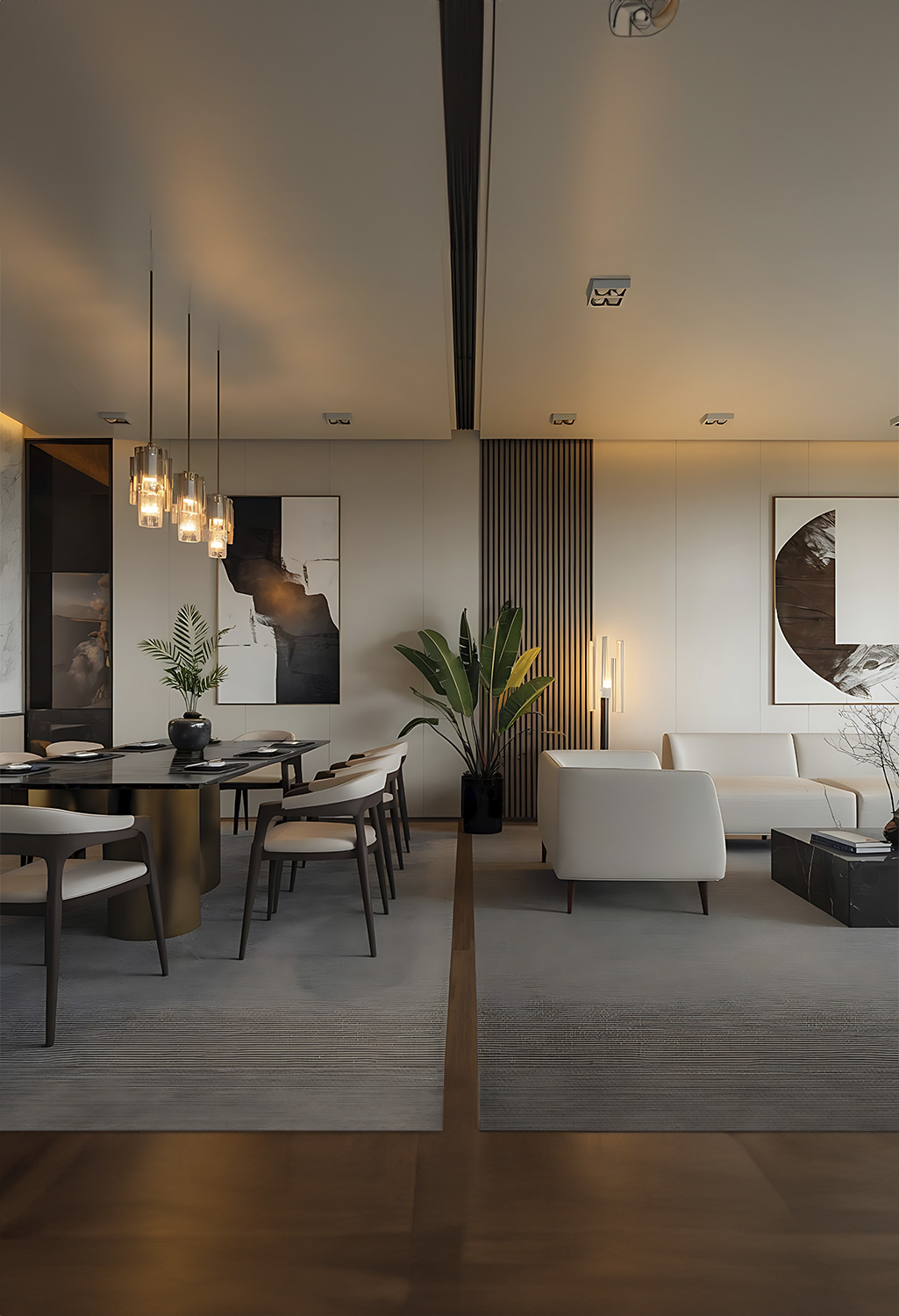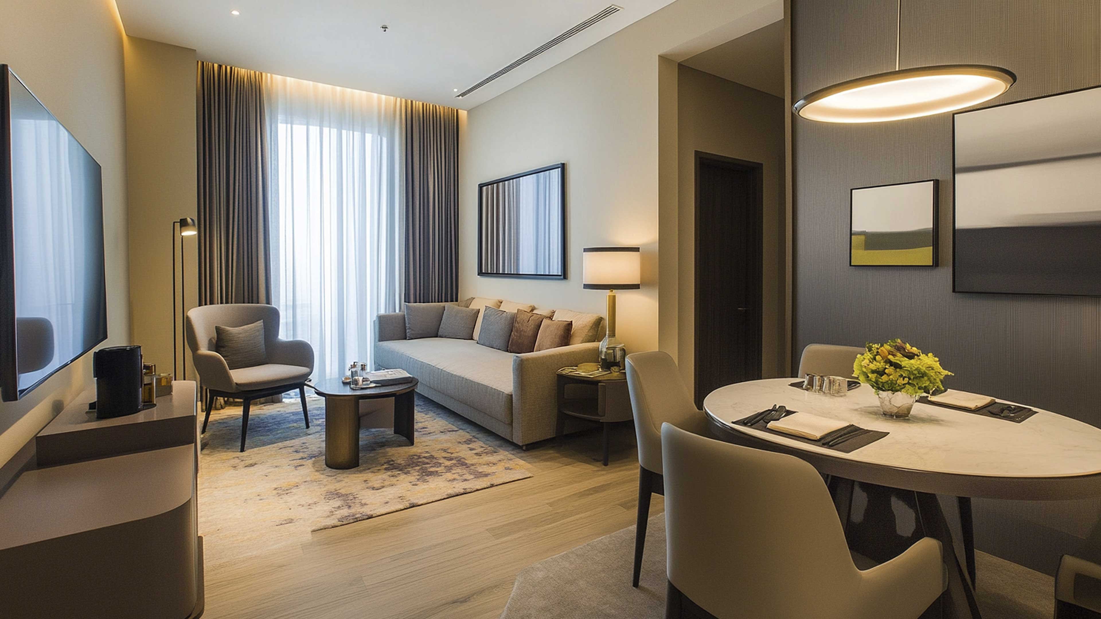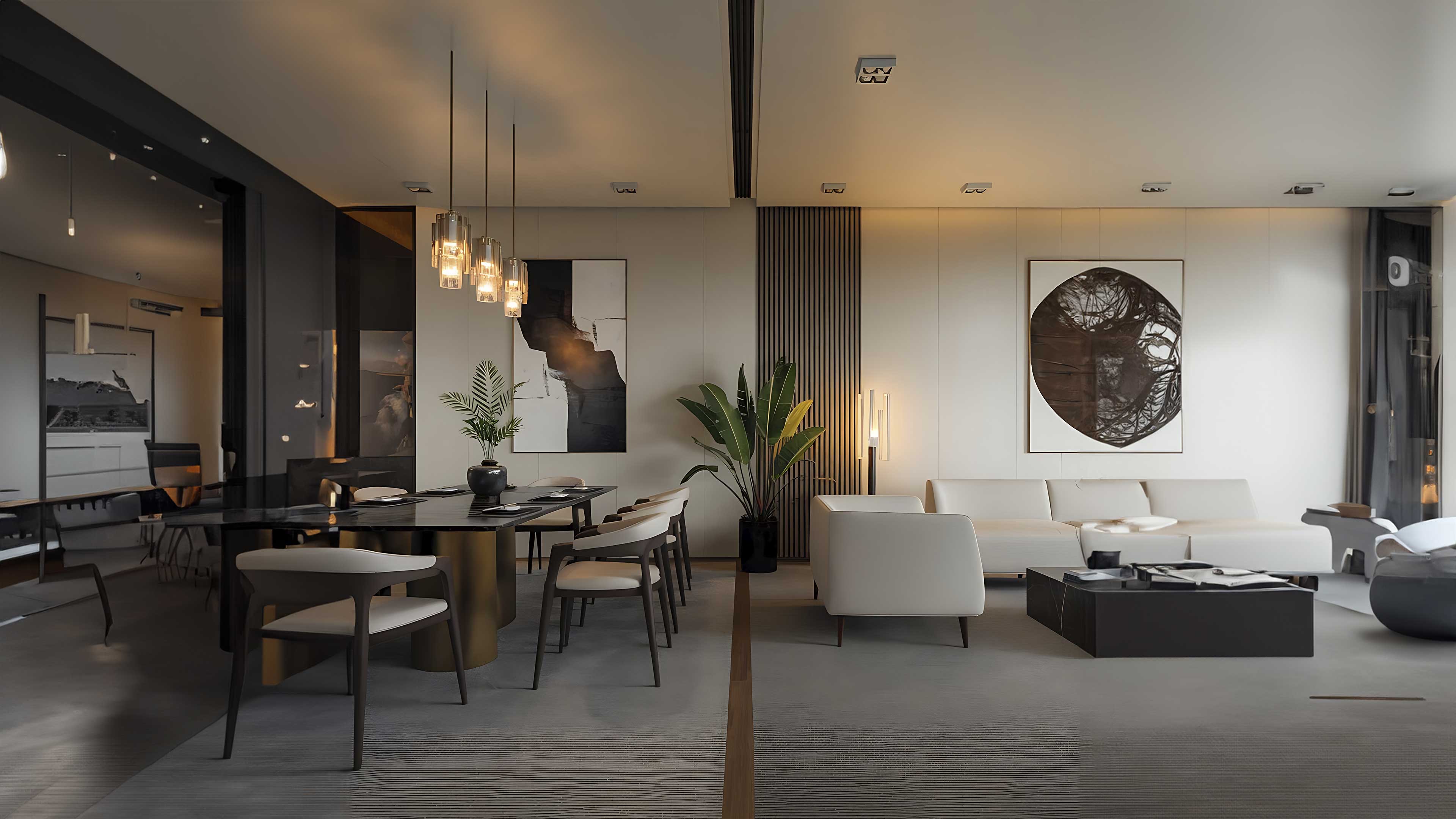 Lujo visible, confort palpable. Lámparas de diseño escultórico ubicadas en áreas sociales, se convierten en piezas centrales del interiorismo, mientras que la iluminación cálida y envolvente, en zonas de descanso contrasta armoniosamente con tonos neutros en espacios funcionales, logrando una atmósfera equilibrada, moderna y profundamente habitable.