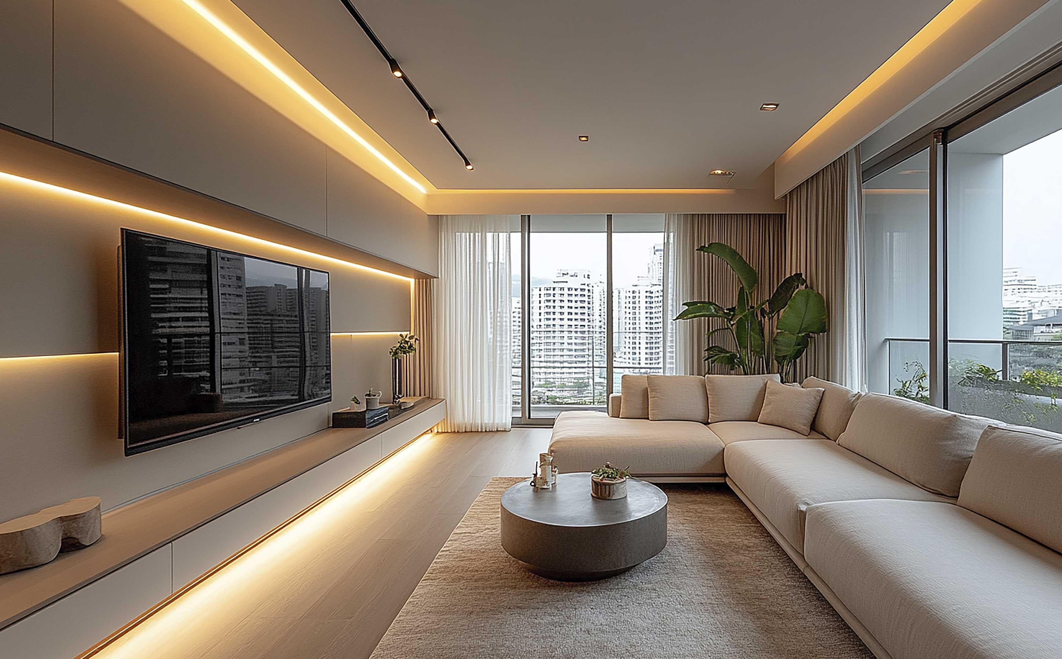 Mediante una plataforma centralizada de control (BMS), el Desarrollo gestiona la iluminación de zonas comunes con precisión automatizada. Dentro de cada residencia, se puede personalizar la luz desde una app, comandos de voz o paneles táctiles, creando escenas programadas como "Cena" o "Relax".
